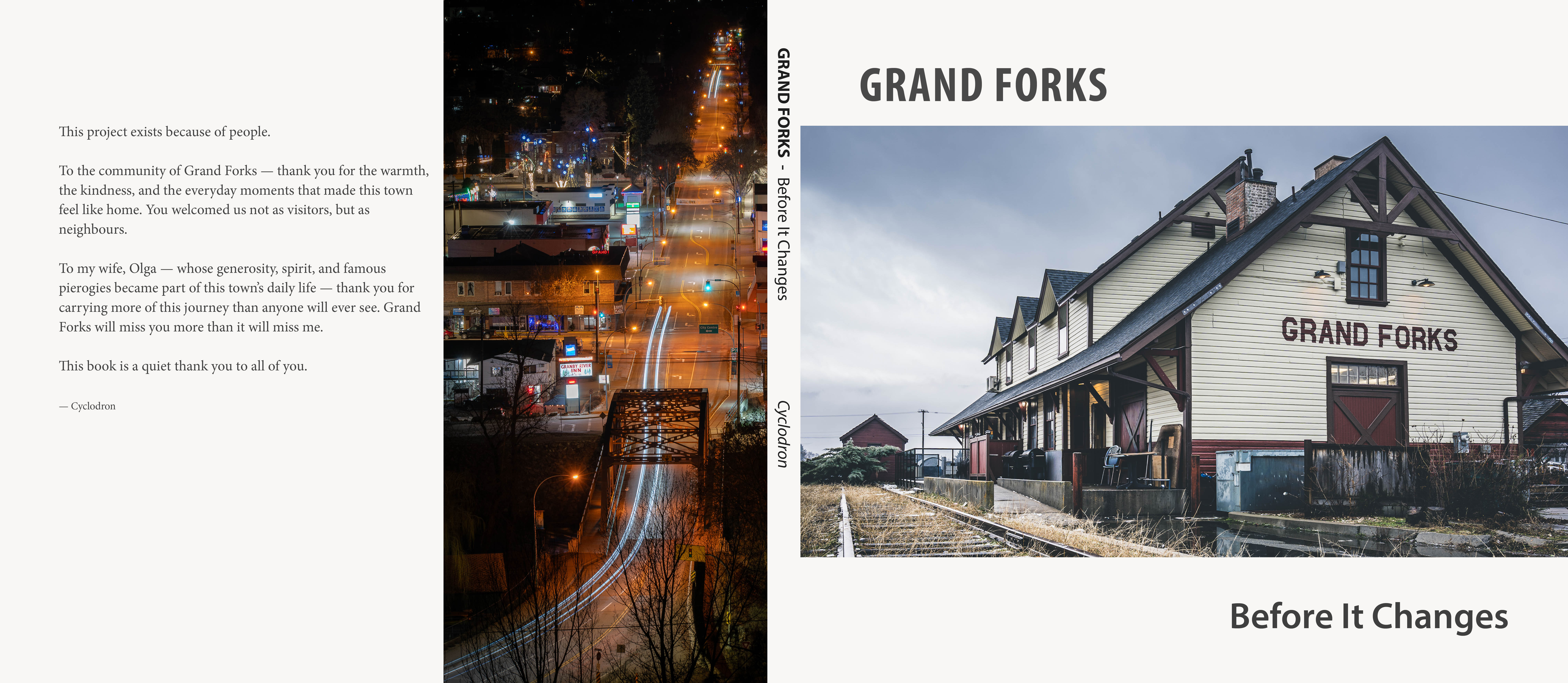 This is a complete photographic book documenting many of Grand Forks’ heritage buildings and older corners. You can explore it here as a digital book, or download the full, print-ready edition for free. The download includes both the cover and the complete interior PDF, prepared for anyone who wishes to archive or print it. For the intended book-like experience, viewing the album on a desktop or laptop is recommended.